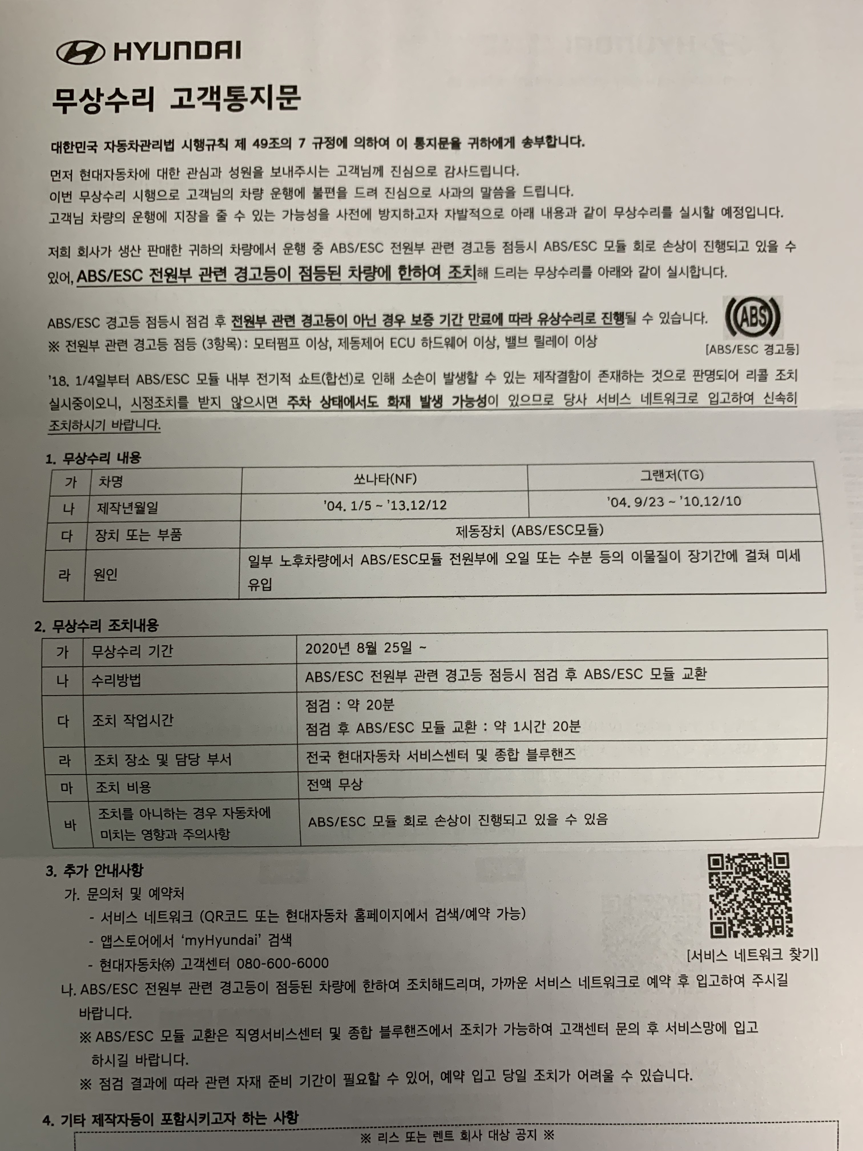๊ทธ๋ฐ๋ฐ ์ฌ๊ธฐ์ ์์ฃผ ์ด์ํ ๊ฒ์ด ABS ๋ชจ๋์ ์ ์ ๊ฒฐํจ์ ์ํ ํ์ฌ ๊ฐ๋ฅ์ฑ์ด ์์ผ๋ฉด ๊ทธ๋ฅ ๋ชจ๋ ๊ตํํด ์ค์ผ์ง.. ABS ๊ฒฝ๊ณ ๋ฑ์ด ๋ค์ด์์ผ ๊ตํํด ์ฃผ๋ค์. ๋ ์ด์ํ ๊ฒ์ ABS ๊ฒฝ๊ณ ๋ฑ์ ๋ถ์ด ๋ค์ด์๋๋ฐ ABS ๋ชจ๋ ์ ์๋ถ ์ด์์ด ์๋๋ฉด ์ ์์๋ฆฌ๋ก ์ ํํ๋ค๊ณ ํฉ๋๋ค. ์ด๊ฑฐ ์ด๊ฑฐ ๊ฑฐ์ ๋ถ์ด ๋ ๊ฒ ๊ฐ์์ผ ๊ตํํด ์ฃผ๊ฒ ๋ค๋.. ์กฐ๊ฑด๋ถ ๋ฆฌ์ฝ์ธ ์ ์ด๋ค์. 10-20๋ ๋ ์ฐจ์ ๋ํด ๊ด๋ฆฌํด ์ฃผ๋ ๊ฒ์ ๊ฐ์ฌํ ์ผ์ด์ง๋ง, NF์๋ํ์ ๊ทธ๋์ TG๊ฐ ๋๋ก์ ์ผ๋ง๋ ๋จ์ ์๋ค๊ณ ์ด๋ฐ ์ผํ ๋นํ ์๋ ์กฐ๊ฑด๋ถ ๋ฆฌ์ฝ์ ํ๋์ง ๋ชจ๋ฅด๊ฒ ์ต๋๋ค. ์ง๋ ๋ฒ ABS ๋ฆฌ์ฝ๋ ์์ฃผ ๊ผผ์์ ๊ผผ์๋ก ์ด์ํ๋๋ฐ.. ํ์ง(?)์ ํ๋์๋์ฐจ๊ฐ ์ด๋ฐ ๋ฌธ์ ์ ๋ํด์๋ ๊ผผ์๊ฐ ์๋ ์ ๊ณต๋ฒ์ผ๋ก ๋์ฒํด ์ฃผ๊ธฐ๋ฅผ ๋ฐ๋๋๋ค.