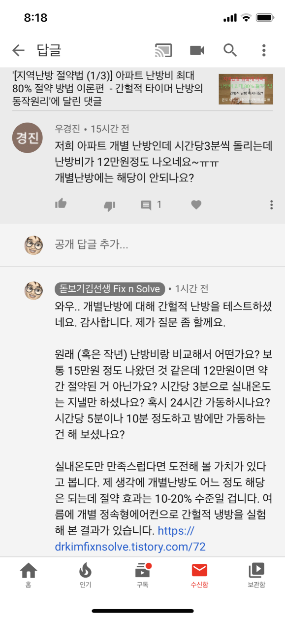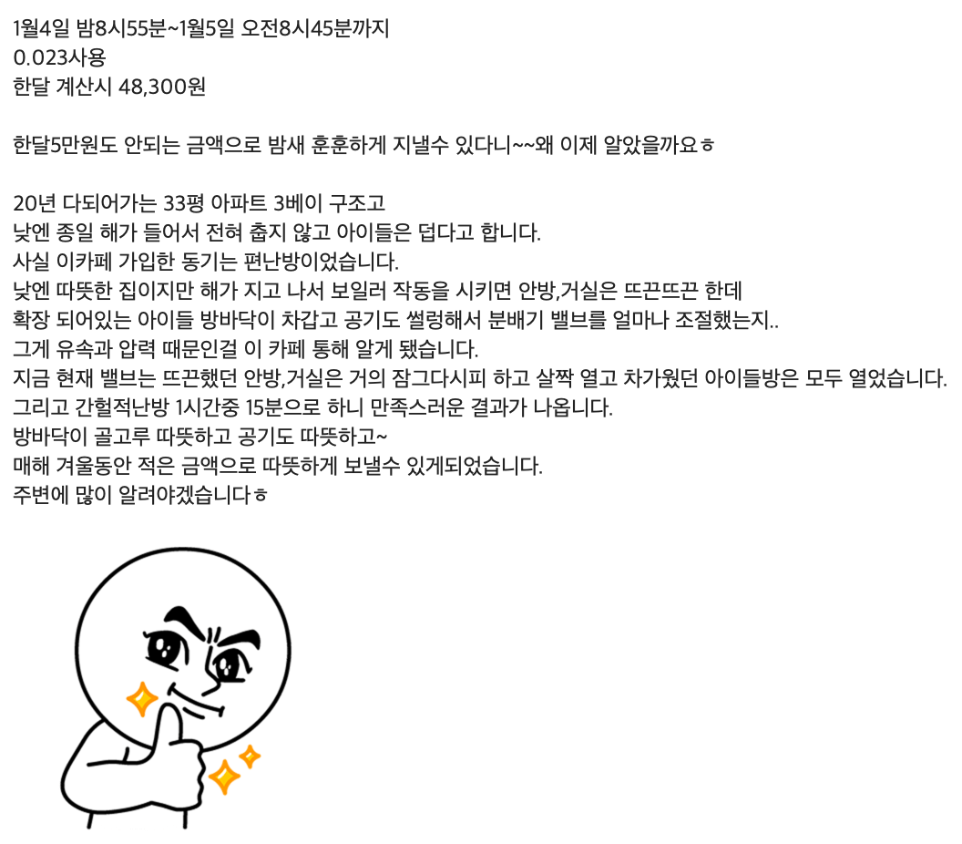 ์ง์ญ๋๋ฐฉ ์นดํ(https://cafe.naver.com/aptheat)์ ๋ณด๋ฉด ์ด๋๊ณ ์ํํธ์์ ๊ฐํ์ ๋๋ฐฉ์ ๋ง์ด ์ ์ฉํด ๋ณด๊ณ ๊ณ์ญ๋๋ค. ์ฑ๊ณตํ ๋ถ๋ค๋ ์๊ณ ์คํจํ ๋ถ๋ค๋ ์๊ณ .. ์ด๊ณณ์ ๋๋ฐฉ๋จ๊ฐ๋ ๊ฝค ๋์์ ํ๊ท ์ ์ผ๋ก 1 MWh ์ ๋ ์ฌ์ฉํ๋ฉด 6-8๋ง์ ๋์ค๋ ๊ฒ ๊ฐ์ต๋๋ค. ๋๋ฐฉ๋น๋ ์ฐ์์ด๋ ๊ฐํ์ด๋ ๋น์ทํ ๊ฒ ๊ฐ๋ค๊ณ ํ์ญ๋๋ค. ๊ทธ๋ผ ๊ธฐ๋ณธ์๊ธ+์ธ๋๊ธํ๋น๋ฅผ ํฌํจํ ์ด์๊ธ์ ๋๋ต 10-12๋ง์ ์ ๋ ๋ ๊ฒ ๊ฐ์ต๋๋ค.