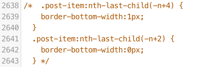 ๋ผ์ธ ์ซ์๋ ์ฌ๋๋ง๋ค ๋ค๋ฅผ ์ ์์ผ๋ last-child๋ก ๊ฒ์ํ์๊ณ ์.. ๋ ๋ถ๋ถ ๋ชจ๋ .post-item ํด๋์ค์์ last-child ๊ด๋ จ๋ ๋ถ๋ถ์ธ๋ฐ ์ ์ ๋ ๊ฒ ๋ค์ด๊ฐ ์๋์ง ๋ชจ๋ฅด์ง๋ง ํฌ์คํธ ์ธ๋ค์ผ ๋ฐฐ์ด์ ๋คํ๋ฆฌ๊ฒ ํ๋ ์์ธ์ผ๋ก ๋ณด์ ๋๋ค.