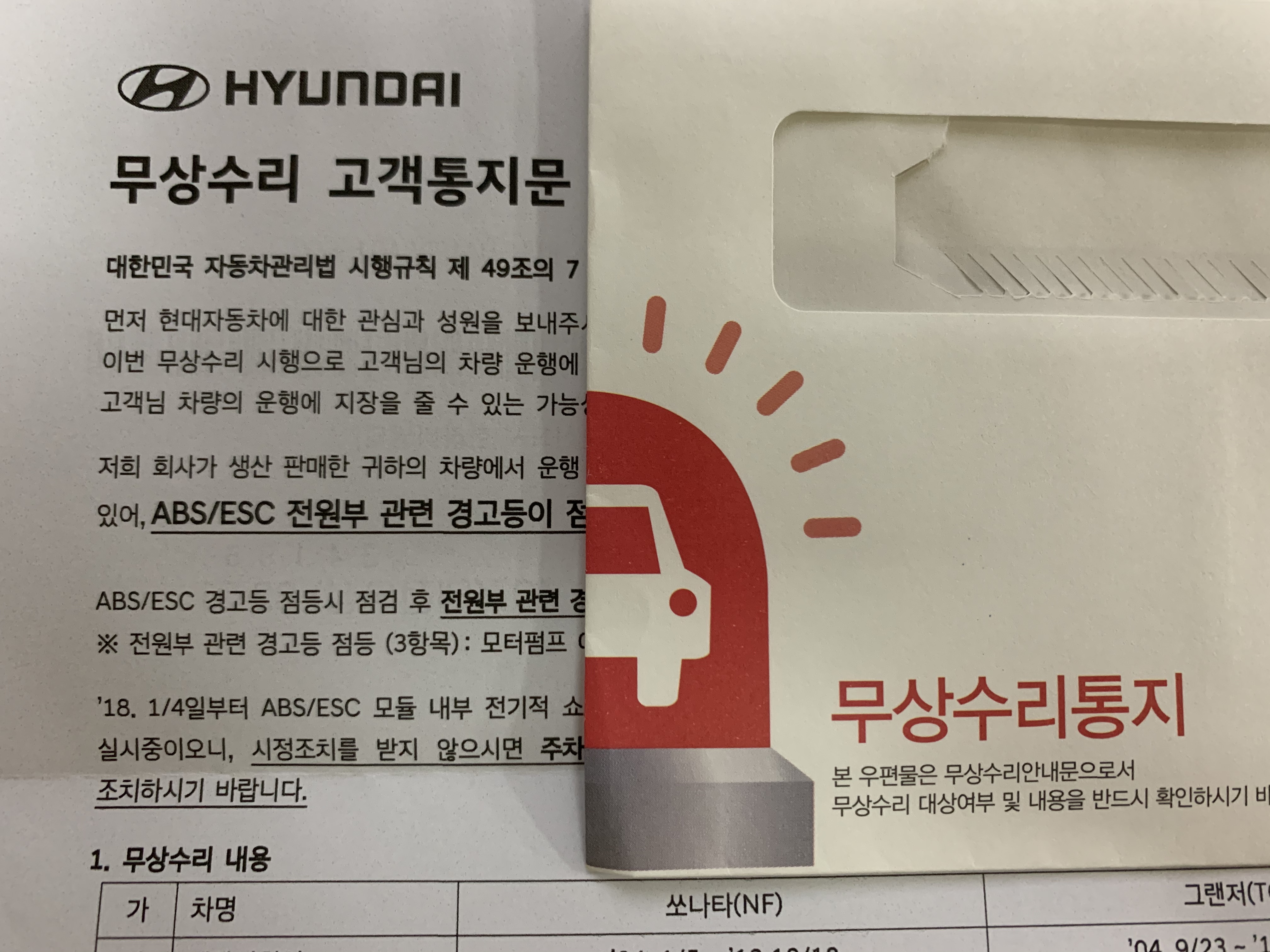 ๊ทธ๋ฐ๋ฐ ์ฌ๊ธฐ์ ์์ฃผ ์ด์ํ ๊ฒ์ด ABS ๋ชจ๋์ ์ ์ ๊ฒฐํจ์ ์ํ ํ์ฌ ๊ฐ๋ฅ์ฑ์ด ์์ผ๋ฉด ๊ทธ๋ฅ ๋ชจ๋ ๊ตํํด ์ค์ผ์ง.. ABS ๊ฒฝ๊ณ ๋ฑ์ด ๋ค์ด์์ผ ๊ตํํด ์ฃผ๋ค์. ๋ ์ด์ํ ๊ฒ์ ABS ๊ฒฝ๊ณ ๋ฑ์ ๋ถ์ด ๋ค์ด์๋๋ฐ ABS ๋ชจ๋ ์ ์๋ถ ์ด์์ด ์๋๋ฉด ์ ์์๋ฆฌ๋ก ์ ํํ๋ค๊ณ ํฉ๋๋ค. ์ด๊ฑฐ ์ด๊ฑฐ ๊ฑฐ์ ๋ถ์ด ๋ ๊ฒ ๊ฐ์์ผ ๊ตํํด ์ฃผ๊ฒ ๋ค๋.. ์กฐ๊ฑด๋ถ ๋ฆฌ์ฝ์ธ ์ ์ด๋ค์. 10-20๋ ๋ ์ฐจ์ ๋ํด ๊ด๋ฆฌํด ์ฃผ๋ ๊ฒ์ ๊ฐ์ฌํ ์ผ์ด์ง๋ง, NF์๋ํ์ ๊ทธ๋์ TG๊ฐ ๋๋ก์ ์ผ๋ง๋ ๋จ์ ์๋ค๊ณ ์ด๋ฐ ์ผํ ๋นํ ์๋ ์กฐ๊ฑด๋ถ ๋ฆฌ์ฝ์ ํ๋์ง ๋ชจ๋ฅด๊ฒ ์ต๋๋ค. ์ง๋ ๋ฒ ABS ๋ฆฌ์ฝ๋ ์์ฃผ ๊ผผ์์ ๊ผผ์๋ก ์ด์ํ๋๋ฐ.. ํ์ง(?)์ ํ๋์๋์ฐจ๊ฐ ์ด๋ฐ ๋ฌธ์ ์ ๋ํด์๋ ๊ผผ์๊ฐ ์๋ ์ ๊ณต๋ฒ์ผ๋ก ๋์ฒํด ์ฃผ๊ธฐ๋ฅผ ๋ฐ๋๋๋ค.
