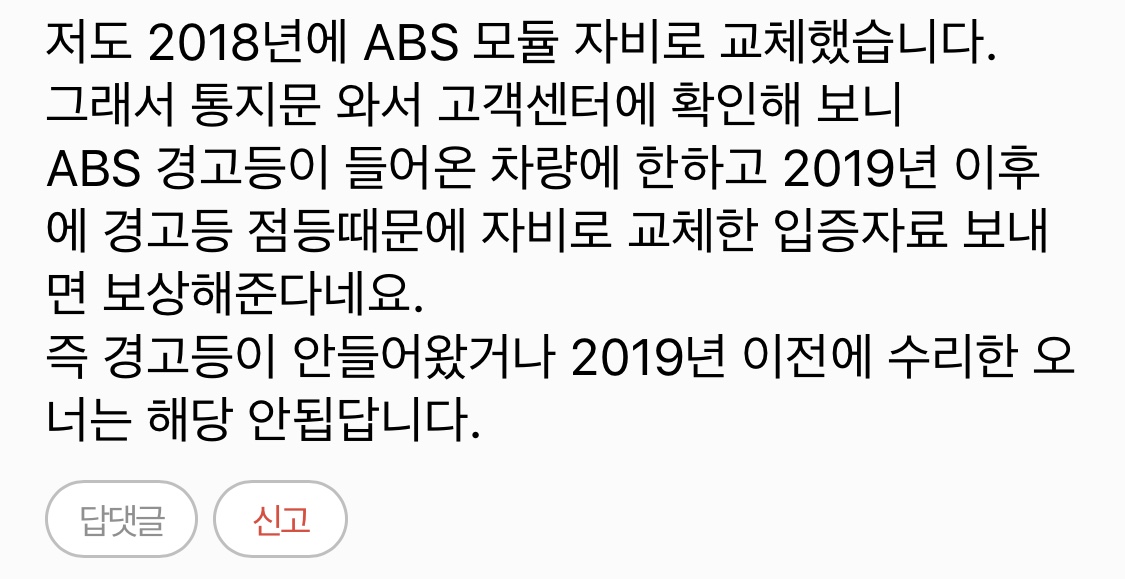 (์ถ๊ฐ 2020/9/10) ABS ๋ชจ๋์ ์ด๋ฏธ ์๋ฆฌ ๋ฐ์ผ์ ๋ถ๋ค๋ 2019๋ ์ดํ์ ๊ฒฝ๊ณ ๋ฑ ์ ๋ฑ์ผ๋ก ์๋ฆฌ ๋ฐ์ ๊ฑฐ๋ฉด ๋ณด์ ๋ฐ์ ์ ์๋ ๋ณด๋ค์. ํ๋ ๊ณ ๊ฐ์ผํฐ์์ ํ์ธํ์ จ๋ค๊ณ ํ๊ณ ์, ์ ์ฆ ์๋ฃ๋ฅผ ๋ณด๋ด์ผ ํ๋ ๋ด ๋๋ค. ๋ค๋ง 2019๋ ์ด์ ์ ์๋ฆฌํ๊ฑฐ๋ ๊ฒฝ๊ณ ๋ฑ์ด ๋ค์ด์จ ๊ฒ ์๋์๋ค๋ฉด ํด๋น ์๋๋ค๊ณ ํ๋ค์. ์๋ ๋ค์ NF ์นดํ์ ์ฌ๋ผ์จ ๋๊ธ์ ์๊ฐํด ๋๋ฆฝ๋๋ค.