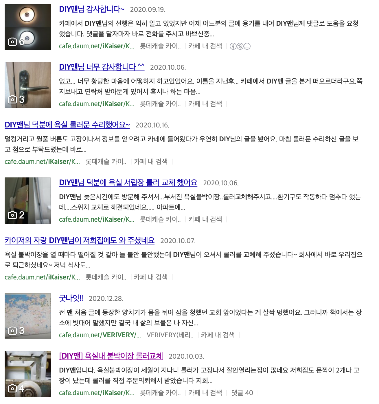 ๋จผ์ , ์ด ๋ถํ์ ์๋ฆฌํ๋ ์ต๊ณ ์ ๊ณ ์๋ ๋ถ์ฐ์ ๋กฏ๋ฐ์บ์ฌ ์นด์ด์ ์ํํธ์ DIY๋งจ์ด๋ผ๋ ๋ถ์ด์ญ๋๋ค. ์ด ์ํํธ๋ ์ ์ฃผํ ์ง 10๋ ์ ๋ ๋๊ณ , ํ์ฅ์ค ์๋ฉ์ฅ ์ฌ๋ผ์ด๋ฉ ๊ฑฐ์ธ์ ์ด ๋ถํ์ด ์ฌ์ฉ๋ ๋ฏ ํ๋ฐ.. ์ธํฐ๋ท ์ ๋ณด์ ์ํ๋ฉด ์๋ ๋ถํฐ ์ง์ค์ ์ผ๋ก ๊ณ ์ฅ๋๊ธฐ ์์ํ ๊ฒ ๊ฐ์ต๋๋ค. ์ด ์ํํธ ์ฃผ๋ฏผ์ด์ DIY๋งจ์ด๋ผ๋ ๋ถ์ ๊ฑฐ์ธ์ฅ ๋กค๋ฌ ๋ฌธ์ ๊ฐ ๋ฐ์ํ์ ๋ถํ์ ๊ตฌํ ์ ์๋ ๊ฒ์ ์๊ณ .. ๋ณธ์ธ ์ง์ ๊ฑฐ์ธ์ ๊ณต์ ์ฌ์ ๋งก๊ฒจ ์ง์ ํธํ๋ถํ์ ์ ์ํ์ผ๋ฉฐ.. ์ดํ ์ํํธ์์ ๊ฐ์ ๋ฌธ์ ๋ฅผ ๊ฒช๊ณ ์๋ ์ฃผ๋ฏผ๋ค์ ์ฌ๋ผ์ด๋ฉ ๋กค๋ฌ ๋ฌธ์ ๋ฅผ ์ง์ (๊ฑฐ์ ์ฌ๋ฃ๋น๋ง ๋ฐ๊ณ ) ์๋ฆฌํด ์ฃผ๊ณ ๊ณ์ญ๋๋ค. ๋ค์์์ "DIY๋งจ"์ผ๋ก ๊ฒ์ํด ๋ณด๋ฉด (search.daum.net/search?w=cafe&DA=PGD&q=DIY๋งจ&find=off&sort=timely&p=6&lpp=10).. ์ด ๋ถ์ ์ ํ์ด ์ฌ๊ธฐ์ ๊ทธ์น์ง ์๊ณ ์ด์ ์ฃผ๋ฏผ๋ค์ ์ ๋ฐ์ ์ธ DIY ๋ฌธ์ ์ ๋ํด ์ ํ์ ํผ์น๋ ๊ฒ์ ์ด์ง ์ฟ๋ณผ ์ ์์ต๋๋ค. ๋ณธ์ ๋ ์์ผ์ ๊ฒ ๊ฐ์๋ฐ, ์ฃผ๋ง์ด๋ ์ ๋ ์๊ฐ์ ํตํด ์ ํ์ ํ๊ณ ์์ด.. ์ฃผ๋ฏผ๋ค๋ก๋ถํฐ ์ฒ์ฌ๋ผ๋ ์ฐฌ์ฌ๋ฅผ ๋ฃ๊ณ ๊ณ์ญ๋๋ค. ์ด๋ฐ ๋ถ ์คํ ๋ฆฌ๋ ๋๋ฆฌ๋๋ฆฌ ํผํธ๋ ค์ผ ํ๋ค๊ณ ์๊ฐ๋๋ค์.