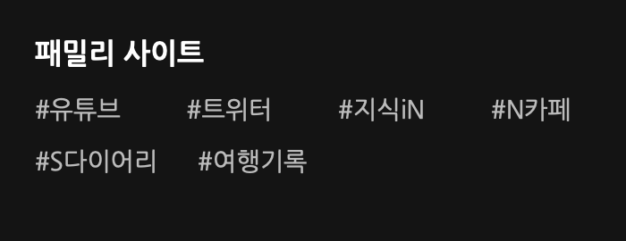 css ์คํ์ผ์ ์ ํด์ค์ผ ํ๋๋ฐ ํ๊ทธ์ ์ฌ์ฉํ๋ tags, items ์คํ์ผ๋ค๋ก ์ฒ๋ฆฌํ์ต๋๋ค. ์ด๋ ๊ฒ ํ๋ฉด ์ฌ์ด๋๋ฐ ๋ฉ๋ด์ ์ถ์ฒ ๋งํฌ๊ฐ ๋ํ๋๊ณ ์ด๊ฒ์ ์ ์ ํ ์ฌ์ด๋๋ฐ์ ๋ฐฐ์นํ๋ฉด ๋ฉ๋๋ค. ์ ๋ ํจ๋ฐ๋ฆฌ ์ฌ์ดํธ๋ผ๋ ์ด๋ฆ์ผ๋ก ์๋์ฒ๋ผ ์ฌ์ด๋๋ฐ์ ์ถ๊ฐํ์ต๋๋ค.