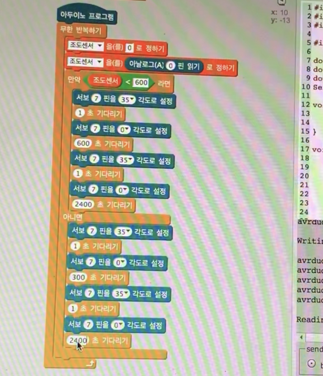 (์ถ๊ฐ 2019/8/3) ์กฐ๋์ผ์๋ฅผ ์ด์ฉํ ๋ฐค๋ฎ ๊ตฌ๋ถ ๊ฐํ๋๋ฐฉ ํคํธ๋ฅผ ๊ตฌํํ๋ ์์์ ๋๋ค. ์ด๋ฐ์ ๋ธ์์ด๊ฐ ๋ธ๋ญ์ฝ๋ฉํ๋ ๋ถ๋ถ์ ๋ฃ์์ต๋๋ค. ๋ฌดํ๋ฃจํ ์์ ์ผ์๊ฐ์ ์ฝ๋ ๋ถ๋ถ์ ๋ฃ์ด์ผ ํ๋๋ฐ ์ด ๋ถ๋ถ์์ ์ฝ๊ฐ ํค๋งธ์ต๋๋ค. ๋ ์กฐ๋์ผ์ ๊ฐ์ 1๋ถํฐ 1024๊น์ง ๋ผ๋๋ฐ ์ฒ์์ ๋ฎ์ ๊ฐ์ด ์ด๋์ด ๊ฑธ๋ก ์๊ณ ์ฝ๋๋ฅผ ์งฐ๋๋ฐ.. ์๊ณ ๋ณด๋ ๋ฎ์ ๊ฐ์ด ๋ฐ์ ์ํ์์ต๋๋ค. ๋ฐค๋ฎ ๊ตฌ๋ถ์ ์กฐ๋์ผ์ ๊ฐ์ด 500 ์ ๋์์ ๊ตฌ๋ถ์ด ์ ๊ฐ๋๋ฐ.. ํ๊ด๋ฑ ๋ถ๋น์ ๋ฎ์ผ๋ก ํ๋จํ๋ ค๋ฉด 600 ์ ๋๊ฐ ์ ๋นํ ๊ฒ ๊ฐ์ต๋๋ค. ๋์ธ ๋ ํ๊ด๋ฑ ํค๊ณ ์ฑ ์ฝ์ผ๋ฉด ๋ฎ์ฒ๋ผ ์์ด์ปจ์ด ๊ฐ๋๋๋ ์์ํ๋๋ผ๊ตฌ์.