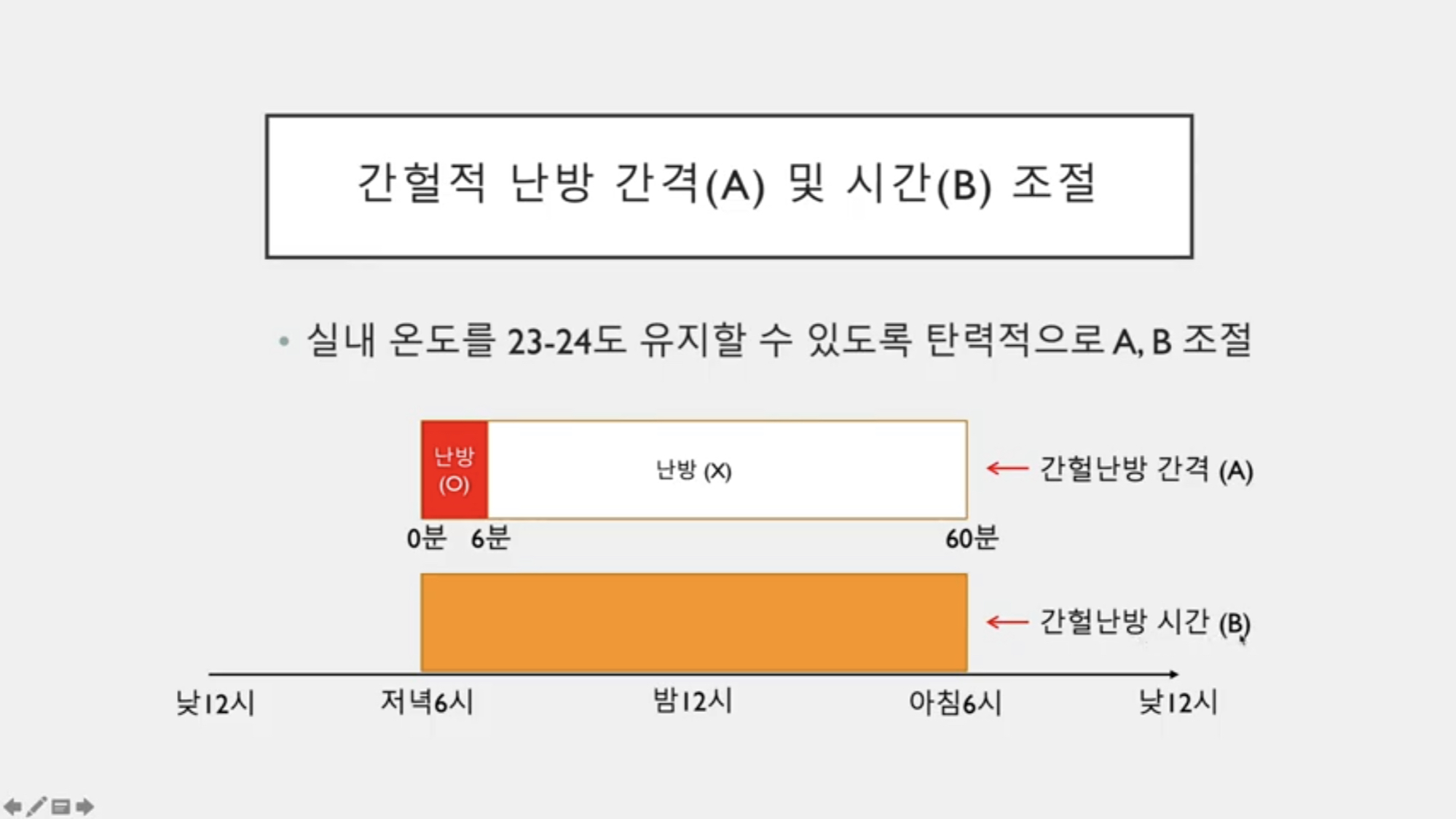 ๊ฒฐ๊ตญ ๋๋ฐฉ์ ์๋ ฅ๊ณผ ๊ฐํ๋๋ฐฉ ์๊ฐ, ๋๋ฐฉ ๋ฉด์ ์ด ์ํธ ์ฝํ ์์ด ์ต์ ์ ๋๋ฐฉ ๋ฐฉ๋ฒ์ ์ฐพ๋ ๊ฒ์ด ์ฝ๊ฐ ์ด๋ ค์ด ๊ฒ ๊ฐ์ต๋๋ค. ์ ํฌ ์ง์ฒ๋ผ ๋๋ฐฉ์ ์๋ ฅ์ 10 LPM์ผ๋ก, ๋๋ฐฉ ๋ฉด์ ์ ์ํํธ ์ ์ฒด๋ก ๊ณ ์ ํ๋ฉด.. ๊ฐํ๋๋ฐฉ ์๊ฐ๋ง ๊ฐ์ง๊ณ ํจ๊ณผ์ ์ผ๋ก ์ง์ ์จ๋๋ฅผ ์กฐ์ ํ ์ ์์ต๋๋ค. ๋๋ฐฉ์ ์๋ ฅ์ด ์๋ค๋ฉด (ํนํ ์ง์ ์จ๋๊ฐ ์ ์์ฌ๋ผ๊ฐ๋ ๊ฒฝ์ฐ์ ํด๋น), ์ ์ ๋๋ฐธ๋ธ๋ฅผ ์ด์ฉํด์ ์๋ ฅ์ ๋์ด๊ฑฐ๋ ์ผ๋ถ ์์ฐ๋ ๋ฐฉ์ ๋ฐธ๋ธ๋ฅผ ์ ๊ฐ ์๋์ ์๋ ฅ์ ๋์ด๋ฉด ๋ ๊ฒ ๊ฐ์ต๋๋ค. ๋๋ฐฉ์ ์๋ ฅ์ด ๋๋ฌด ๋๋ค๋ฉด (ํนํ ๋๋ฐฉ๋น๊ฐ ๊ณผ๋ค ์ฒญ๊ตฌ๋๋ ๊ฒฝ์ฐ ํด๋น) ๋ฐธ๋ธ๋ฅผ ์ ๊ทธ๊ฑฐ๋ ๋ชจ๋ ๋ฐฉ์ ์คํํด์ ๋๋ฐฉ์ ์๋ ฅ์ ๋ฎ์ถฐ์ค์ผ ํฉ๋๋ค. ์ ์ ๋๋ฐฉ์ ์๋ ฅ๊ณผ ๋๋ฐฉ ๋ฉด์ ์ ์ ํ๋ค๋ฉด.. ์ด์ ๋ถํฐ๋ ๊ฐํ๋๋ฐฉ ์๊ฐ์ ์กฐ์ ํด์ ์ค๋ด ์จ๋๋ฅผ ์ํ๋ ์จ๋๋ก ๋ง์ถ๋ฉด ๋ ๊ฒ ๊ฐ์ต๋๋ค.
